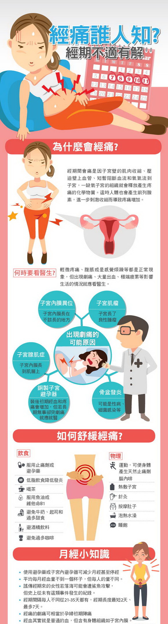 女性一生之中会花约40年的时间每个月和经期奋斗,有些女性经期来的时疼痛相当剧烈。原因是经期间子宫收缩,若收缩暂时阻断往子宫的血流和氧气,就会引发人体产生会刺激更多疼痛的化学物质。虽然经痛严重可比拟生产初期的阵痛,但可以利用饮食和运动减缓疼痛。减少油腻食物、酒精和咖啡的摄取,并搭配舒缓运动如瑜珈、热敷、按摩、热水澡等,就可有效降低经痛。