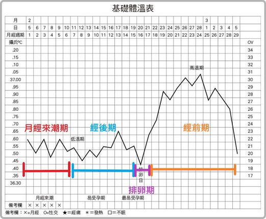 我们可以看到,基础体温会以排卵期为分界点,出现高低两种分布范围。从月经来潮直到排卵期之前,基础体温会大概落在36.0°C~36.5°C之间,这段时期称为“低温期”。排卵期后,基础体温会急遽上升到36.7°C以上,并持续这样的高温直到月经来潮之前,这段基础体温维持在36.7°C以上的时期称为“高温期”。高温期后,体温往下降到36.7°C以下,月经就会来潮,并周而复始地持续以上变化,直到停经。