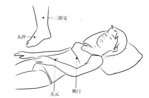 五行中,肝为肾之子,肾是月经最关键的控制部位。肾出现了问题, 月经的周期也会随之混乱。至于乳房胀痛、心烦意乱,则属肝郁的迹象。 在月经来的前5天,可疏理肝郁,用的就是太冲和期门。太冲消“气”解 郁已不需多提,倒是位于肝经的期门需要认真地找一找。它在乳头下方, 第六根肋骨下的缝隙里,但一定要注意,这里的皮肤组织很薄,按压的时 候不要太过用力,以免出现瘀青的现象。接着,按压关元和三阴交。具体 方法是,每天下午5时左右先按太冲3分钟,然后按揉两侧期门2分钟, 三阴交则需要至少按压2分钟,然后平躺手指按压关元1分祌,最后手掌 放在关元穴,集中意念做20次腹式呼吸。