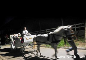 晚上9时,婚礼正式拉开帷幕。草坪旁的小道上,白色马车缓缓行进,新娘端坐在车内,笑容嫣然,新郎罗敏驾着黑马上前迎接……