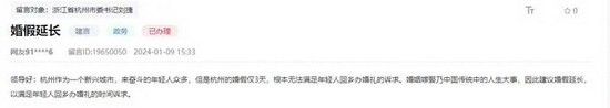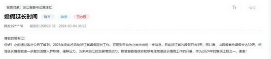 “操办婚礼比上班还累,时间太紧张了”“来杭州奋斗的年轻人众多,但杭州的婚假仅3天,无法满足年轻人回乡办婚礼的时间诉求”……今年以来,有多名网友在人民网“领导留言板”上呼吁浙江延长婚假.