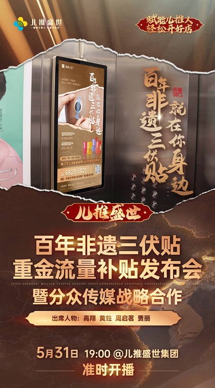 为加强国民对“冬病夏治,三伏调理”的认知,进一步推动中医药的健康发展——国内儿推行业头部担当儿推盛世携手全球最大的电梯媒体集团分众传媒,达成战略合作,立意于【百年非遗三伏贴·就在你身边】,免费为全国所有儿推门店投放电梯广告,重金流量补贴,赋能儿推门店。