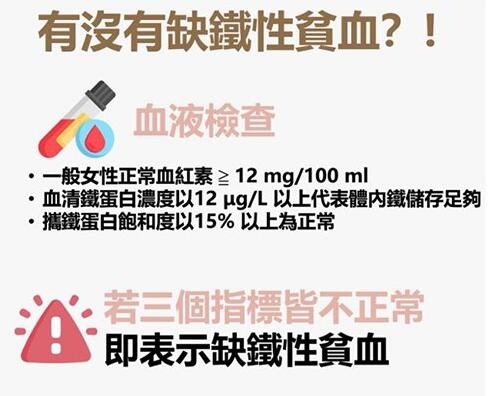 一般会建议可以做血液检查,女性正常血红素≧12 mg/100 ml、血清铁蛋白浓度12μg/L 以上代表体内铁储存足够、携铁蛋白饱和度15%以上为正常。