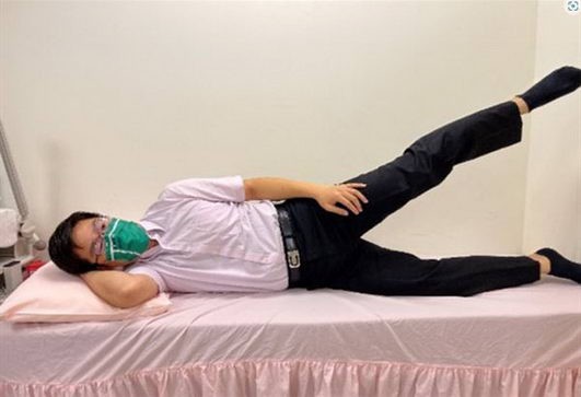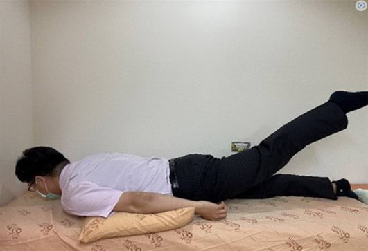 (图三) 臀肌肌力训练(如果颈部有压力,可以双手交叉放在额头下方,让颈部肌肉放松,核心锁稳后,大腿往后抬起,高度不需要太高。)