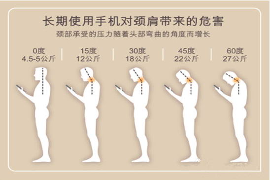 研究发现:人类头部重量大约重5公斤,正常的颈椎生理曲度可以减轻颈椎支撑头部的负担。当前倾看手机等电子设备时,通常呈60°角,由于重力和杠杆作用,颈部肌肉就要承受25公斤以上的重量。