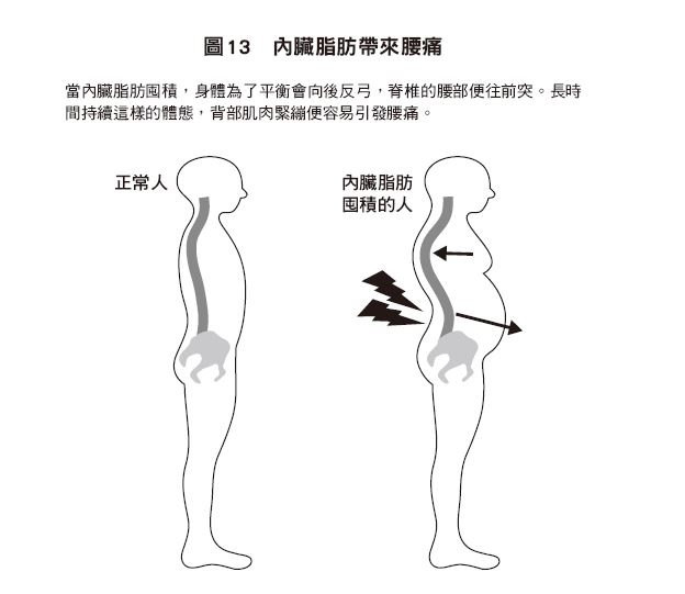 孕妇的腰痛也是类似的问题,不过孕妇只要生产完,就能恢复原有体态,但内脏脂肪并不会自己排出去。更糟的是因为腰痛而不想动,身体就变得更胖,腰痛也跟着恶化,许多人都陷于这样的恶性循环中。