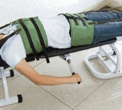 当牵引时,腰椎的屈曲幅度可通过垫枕于骨盆底下及前述的方式加以控制。如想采用仰卧位后伸牵引,俯卧位则可能是最好的选择。而骨盆牵引带应置于前外方向牵拉。采用前外方牵拉的俯卧位牵引。该技术能应用于部分腰椎后凸患者。牵引的实际重量由绳索角度及将牵引桌面调整为后伸来控制。俯卧位牵引对缓和剧烈疼痛及肌卫有特效。患者可置于俯卧位作为治疗方式而后不移动病人而进行牵引。牵引模式选择将依靠病人的状态及是否舒适。维持牵引和长紧张时间的交替牵引对椎间盘突出症更有效,而关节运动受限及退行性椎间盘疾病对短紧张时间的交替牵引更有效。某些机械牵引装置在维持牵引时相对无效主要因无法消除治疗期间的松弛效应。为了更有效,机械牵引设备在患者放松时能否持续克服松弛是重要的一环。当治疗腰突症时,牵引时间应短些。由于椎间盘间隙的增宽,椎间盘内压随之降低。由于渗透力量很快平衡周围组织的压力,提示压力的降低仅能维持短暂的时间。当压力达到平衡时,突出物吸纳效应马上丧失。如果这样,当病人中止牵引后盘内相对周围组织的压力会逐渐上升,治疗后疼痛再现。如果这样,可以交替牵引延续10分钟以上或维持牵引延续8分钟以上,一般都会有较好的效果。