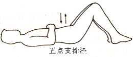 3、抱膝触胸:仰卧位双膝屈曲,手抱膝使其尽量靠近胸部,然后放下,一上一下为一个动作,连续作20-30个。 4、五点支撑法:仰卧位双膝屈曲,以足跟、双肘、头部当支点,抬起骨盆,尽量把腹部与膝关节抬平,然后缓慢放下,一起一落为一个动作,连续20-30个。(图示)