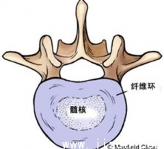 髓核位于纤维环与软骨板之间,有一种粘胶样物质,由粘多糖和胶原纤维组成。正常髓核含大约80%以上的水分。髓核的含水量随着年龄的增长而逐渐减少。髓核组织也可被软骨组织所代替,故成年人髓核与纤维间没有清楚的分界。