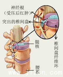 腰骶神经根从硬脊膜囊的前外侧穿出,在椎管内斜向外下走行,经椎间孔出椎管。腰3及腰4神经根各自从相应的椎体的上1/3或中1/3水平离开硬膜囊,紧贴椎弓根进人椎间孔。腰5神经根由腰4腰5的椎间盘水平或其上缘离开硬膜囊,向外下走行,绕椎弓根进人腰5骶1之间的椎间孔。骶1神经根发自腰5骶1椎间盘的外1/3,绕骶1椎弓根进人推孔。了解了神经根与椎间盘的关系后,就可以理解为什么不同部位的腰椎间盘突出,可以引起不同部位的症状和不同的体征。