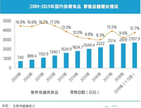 根据大健康相关数据表明,我国健康服务产业的产值在2020年将高达8万亿!因为2020年,我国60岁以上老年人将超过2.5亿人,2030年将达4亿人,营养保健食品是中老年人的刚性需求。同时这次疫情,全民对健康的重视又上升了一个新高度!综合过去十年国内营养保健食品零售总额的增速来看,平均保持了超过10%的增速,这个数据远超国内社会消费品零售总额的增速。