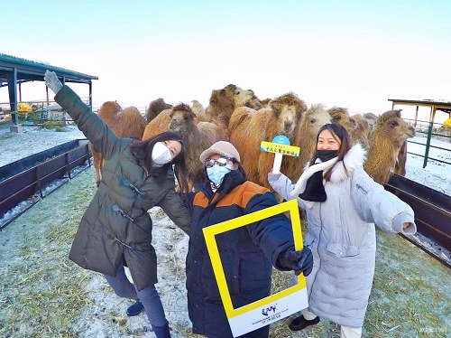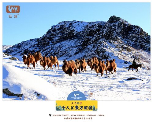 第二天一早,从福海出发,经过了雅丹地貌,和冰冻的额尔⻬斯河,驱⻋约200公里,就到达了位于吉木乃县,旺源集团在中国筹建的第一个万驼园。