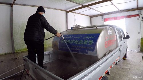 在将近半小时的检测结束后,37号运奶车准备进行登记并开始卸奶。运奶⻋到达厂区完成采样、检测、卸奶后,最后一步就是清洗环节了。为了保证每天采奶的卫生与安全,每一辆运奶⻋在卸奶后都需要进行从里到外的清洁步骤。你可以看到运奶⻋师傅在用高温水枪对罐体和⻋体进行仔细的清洗。
