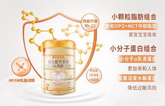小分子奶粉,蕴含着喜安智呵护宝宝娇嫩肠道的全新努力。众所周知,牛乳的蛋白质和脂肪分子相对较大,对于肠道尚未发育完全的宝宝而言较难消化。喜安智小分子蛋白质+小颗粒脂肪的组合,通过对乳清蛋白和酪蛋白进行适度水解,转化为小分子肽及氨基酸,添加天然纳米级小分子蛋白 α-乳清蛋白,提高蛋白质生物利用率让宝宝娇嫩肠道更好消化。采用1微米(μm)以下的脂肪球 OPO结构脂、MCT(中链脂肪酸)、MFGM(乳脂球膜)等小颗粒脂肪组合,减少宝宝肝脏、肠道系统等造成的机体代谢负担。