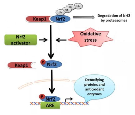 Nrf2-ARE是目前最为重要的抵抗内外界氧化应激的防御性传导通路。其中,核因子红细胞相关因子2(nuclear factor erythroid-related factor2,Nrf2)是管理和控制内源性抗氧化系统最重要的分子,可通过诱导相关蛋白质的表达,比如血红素氧合酶1(heme oxygenase 1,HO-1),来对抗氧化应激和各种毒性物质。由于其内源性特点,所以研究氢气对其的调节,可为实现有效、可控的抗氧化改善开辟新途径。