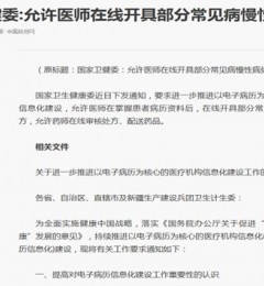国家卫生健康委近日下发通知,要求进一步推进以电子病历为核心的医疗机构信息化建设,允许医师在掌握患者病历资料后,在线开具部分常见病、慢性病处方,允许药师在线审核处方、配送药品。...【浏览全文】