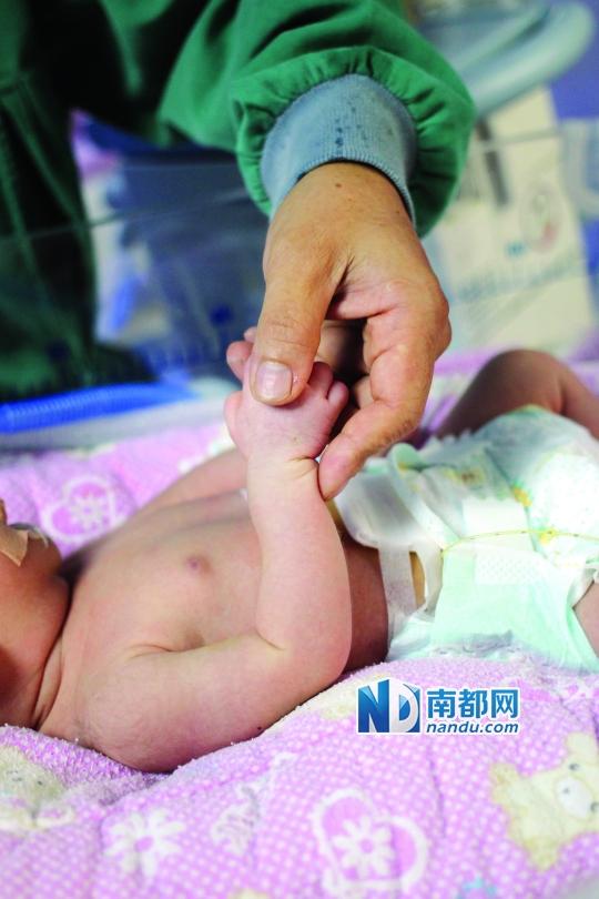 昨日下午,江门市妇幼保健院。探视期间,陆清富一直拉着女儿的小手。南都记者 孙振飞