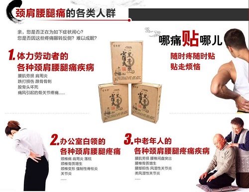 3.膏药适合人群:范围广,男女老少不限、小青年,中年人,低头族,白领层等,几乎每个家庭都有这个需要。。