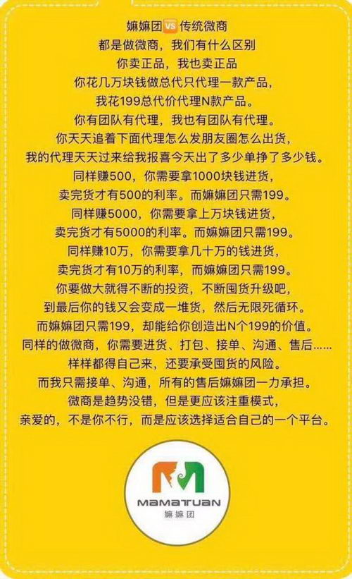 如果你是宝妈,想尝试微商,嫲嫲团199终身会员低投入,0风险让你迅速启航。不用自己囤货,不用自己发货,不用自己找图片,不用自己编辑文案,不用自己做产品对比,全程保姆式服务,最重要的一点,代理一个嫲嫲团相当于代理几百种产品,小投入大产出尽在嫲嫲团。