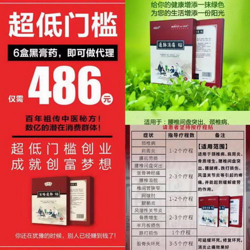 付济华通脉消痛贴是非常值得代理的。第一:膏药覆盖面积太广了!颈肩腰腿痛的人太多了,经常玩手机的低头族,很多有颈椎病,上班族久坐都有腰椎病,老年人有骨质增生腰腿痛。就这个市场,也非常容易做。第二膏药是按疗程使用,一个疗程3盒病情轻的人也需要1~2个疗程,付济华黑膏药通脉消痛贴的复购率是极高的,在不需要吃药打针做理疗的情况下,就可以帮助人体解决各种疼痛问题,付济华黑膏药通脉消痛贴全国统一价147一盒,只要486元就能拿6盒,这样更划算,自己用便宜,还能创业做微商,成就一番事业。