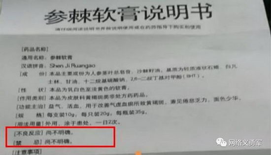 绝对一点也没关系,只要你试验做的长、技术又新又高,能证明这些药只发挥正面作用不施放副作用也行,我们也会相信你。但是他做到了吗?我们来看一下说明书的介绍:有什么不良反应?尚不明确。有什么禁忌呢?也是尚不明确。哇靠,一个什么都不明确的东西你就发广告胡吹百分百无毒副作用,你哪来的自信?按照谭总的逻辑:这就是每天用一点,离天堂更近一些的毒药膏啊。