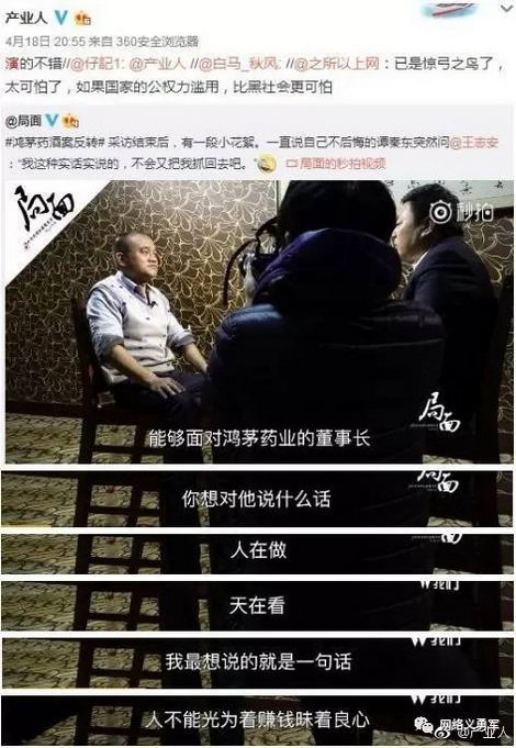 在问到如果面对红毛药酒的董事长希望对他说什么话时,谭总大言不惭的说:人在做,天在看,我最想说的一句话就是,人不能光为赚钱昧着良心。