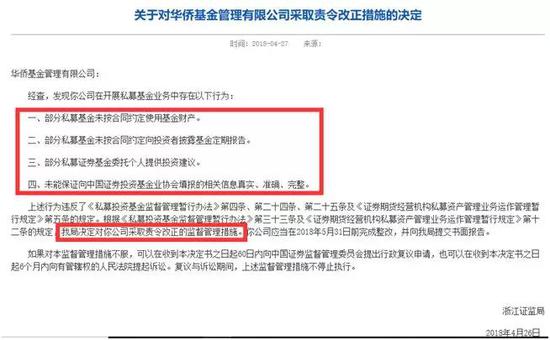 4月26日,浙江证监局发布《关于对华侨基金管理有限公司采取责令改正措施的决定》的公告。该公告称,私募机构华侨基金在开展私募基金业务中存在以下行为:一是部分私募基金未按照合同约定使用基金财产;二是部分私募基金未按合同约定向投资者披露基金定期报告;三是部分私募证券基金委托个人提供投资建议;四是未能保证向中国证券投资基金业协会填报的相关信息真实、准确、完整。