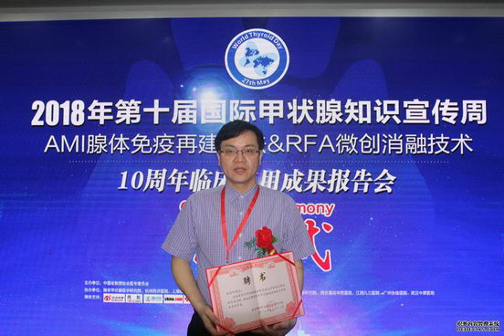 国际甲状腺名医远程会诊中心的成立,杭州同济甲状腺医院甲状腺专家刘金怀主任因多年来在甲状腺诊疗领域成绩突出,被聘为“AMI腺体免疫再建疗法&RFA微创消融技术”临床应用首席专家。