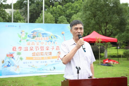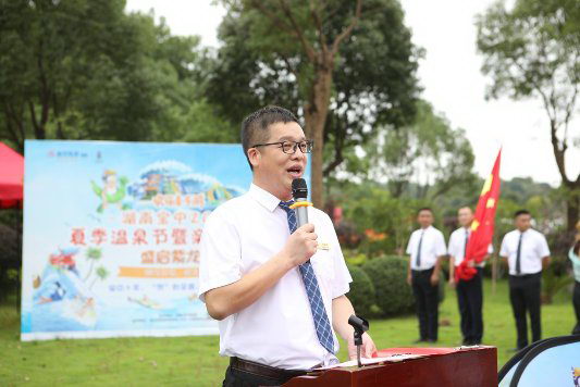 湖南紫龙湾温泉度假有限公司董事长赵万立先生与湖南宝中旅游董事长邱克西先生分别致辞。赵万立董事长对各位嘉宾和游客的到来表示热烈欢迎,并表示紫龙湾将发挥自身旅游资源优势、技术优势、区位优势,做好为市民与游客全力打造一个项目齐全、服务贴心,玩乐开心的旅游胜地,提供夏日出游避暑的好去处。