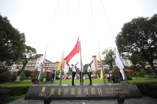 在雄壮的义勇军进行曲中,五星红旗与紫龙湾司旗在紫龙湾前坪冉冉升起,紫龙湾飘雪温泉节暨亲子水上嘉年华启幕仪式正式开始。