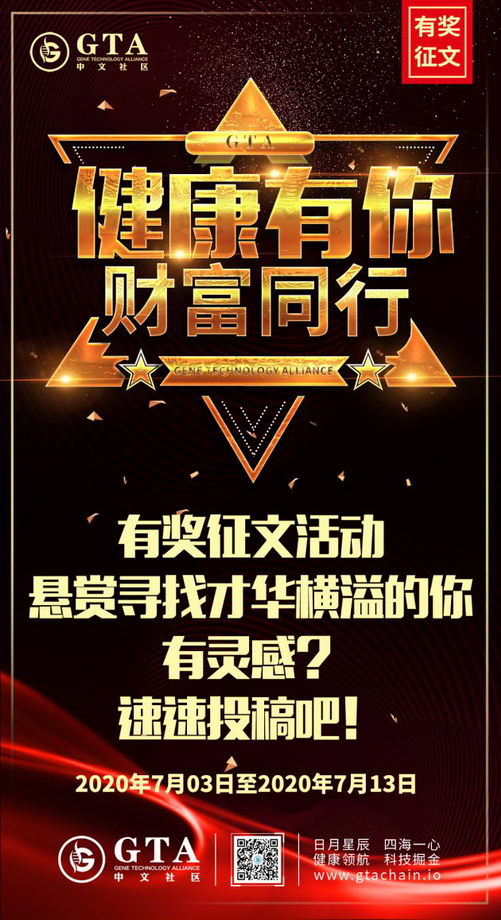GTA基金会为让更多人了解基因科技的商业价值和基因数据存储的意义,感知基因科技为人类带来的美好与富足,弘扬GTA精神文化理念,促进人们对GTA基因链的理解,认同和共识,为全人类健康发展做出更大贡献,经GTA基金会研究决定,在GTA中文社区开展有奖征文大赛,此次赛事承载了GTA深厚的精神文化内涵,是对GTA开创区块链+的一次完美诠释。所有参与者可任意发挥自己的才能,对项目进行深度理解和剖析。GTA中文社区将对入围的所有投稿者进行奖励,并评选刊登优质文章。