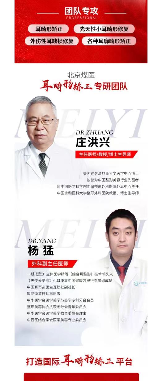 北京煤医医疗美容医院位于北京朝阳区核心地段,诊疗面积约4000平方米,前身为中国较早公立创办的煤炭总医院整形美容中心,是由国家卫生部门审批成立的一家集医疗、科研、教学与艺术为一体的正规化、现代化、综合性大型医学整形美容机构,拥有6大诊疗体系,尤其在耳畸形矫正方面尤为突出。并由庄洪兴教授牵头成立了“耳畸形矫正医疗团队”。