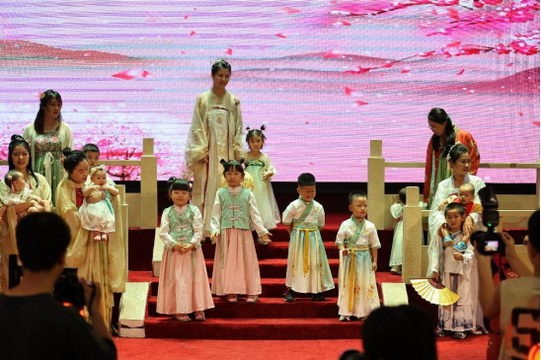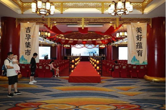 当日,主办方别开生面的现场布置引人入胜,朱红大门开启,衣着盛唐服饰及头饰的工作人员举着金黄纸灯笑意盈盈的迎接,让人仿佛置身古代达官显贵的大宅,一眼望去,热闹的集市,高亢的叫卖,引陆续进入会场的孕妈准爸“哇”声一片,十月怀胎的辛苦,在这一刻似乎得到了暂时的慰藉和释放。