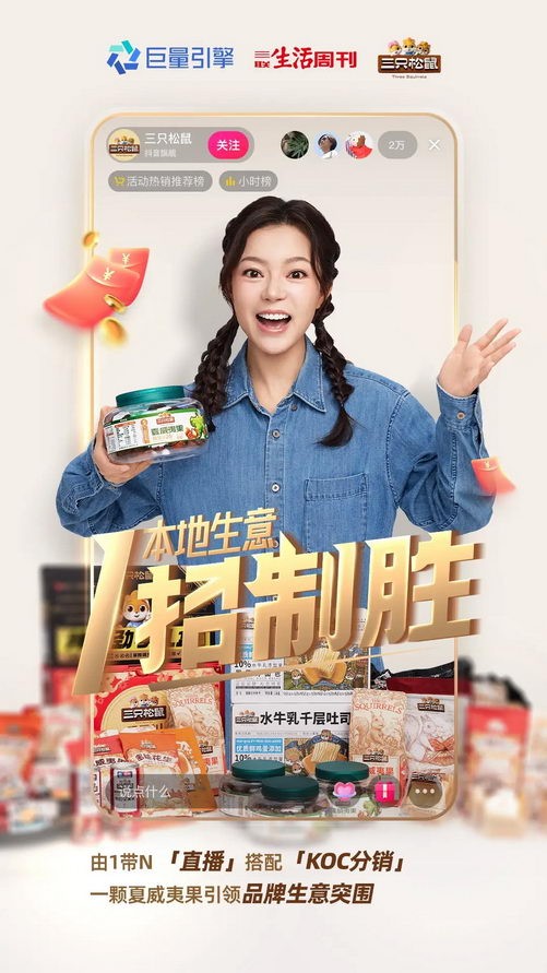 依托于巨量引擎营销工具与数据支持,三只松鼠“重整河山”,强势跨出“品销合一”和“一品一链”的一大步,线上高效调优实现爆发、线下差异化组货布局本地生活。通过首创的「KOC分销+达播+自播+商城运营」锚定行业趋势「品类」,利用第一个干万级产品,全年带动30款+百万级大爆品出街。
