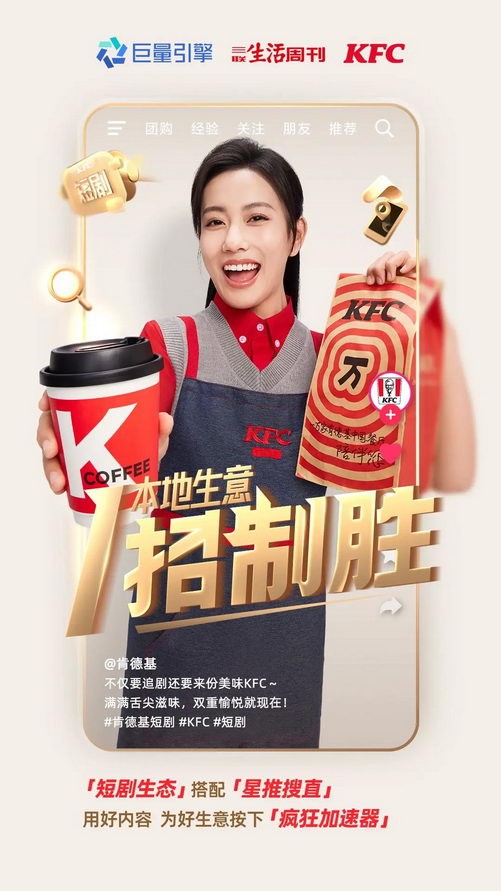 传统新年节点,肯德基联动达人@姜十七 尝鲜短剧赛道,为爆品发财桶套餐定制短剧《命中注定快发财》,通过剧情深度植入,实现“快发财新春大金桶”深度种草,迅速登上抖音短剧榜前列。今年肯德基趁热打铁,又推出定制短剧《重生之吃货皇后惹不起》,由短剧爆款女主主演,融合当下短剧最热门剧情元素,全网播放量破亿。