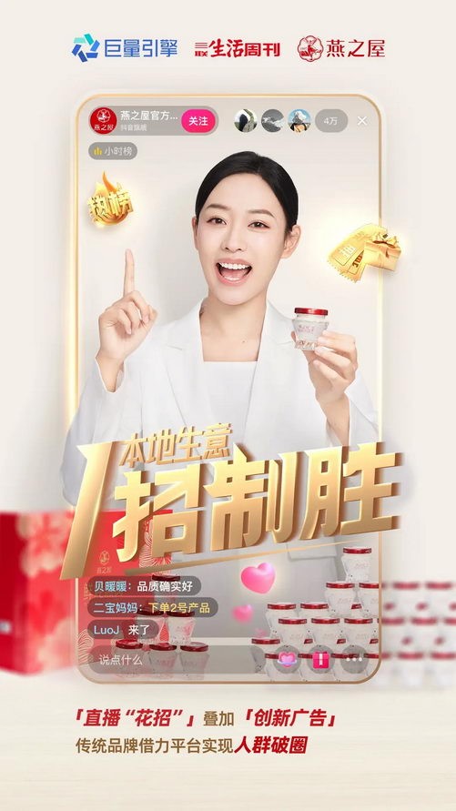 在直播领域,燕之屋也布局了品牌的经营矩阵,结合抖音实时热点与明星达人效应进行精细化运营,覆盖了诸多具有潜力的营销场景,完成一轮轮强势拉新种草和品牌人群资产积累。同时,品牌更借助头部达人势能和粉丝效应,落地燕窝工厂溯源专场,邀请产品经理、运营总监等中高层打造品牌周年庆专场,直播间设计转盘抽黄金、黑神话悟空账号等多种年轻化互动玩法,精准踩中热点,让品牌在快速运转的平台始终保持新鲜感和活力。