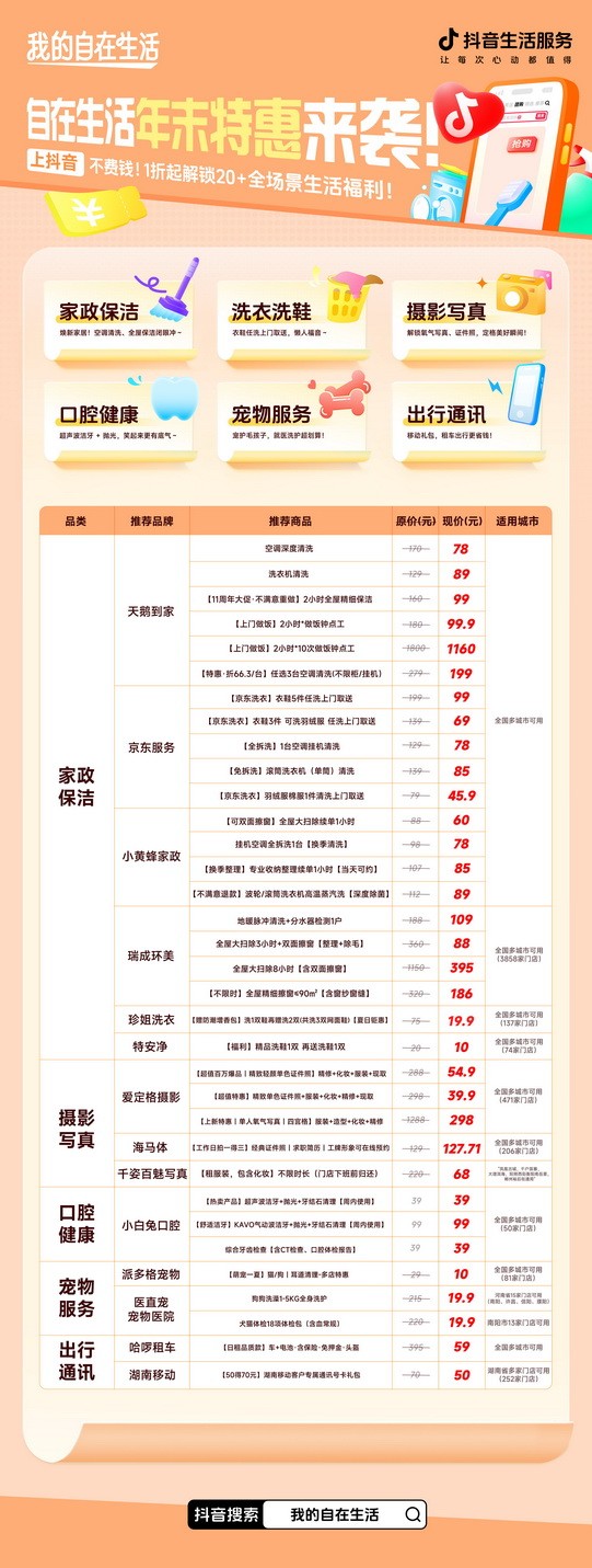 12月12日上午10点,记得准时锁定抖音「我的自在生活」主会场,抢限量 “8元无门槛居家生活券”,更可叠加享受 “满120元减18元” 等多重平台优惠。主会场内特设“年度焕新特惠专区”,众多精选品质服务直接1折起,为你提供最具诚意的省心之选。
