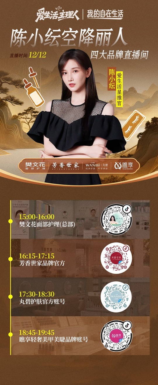 12月12日,“爱生活星推官”陈小纭空降4大品牌直播间,联动万岁山景区初雪场景,带来了一场长达数小时的自在生活浪漫直播盛宴,突破2796万+, 从下午15:00开始,她依次亮相了:樊文花、芳香世家、丸碧、瞧享 四大品牌直播间,与用户分享护肤变美心得,并带去专属直播间福利。