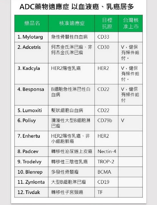 由上表可见,已有12款ADC药物通过美国食药局(FDA)核准,且有相对应的适应症,包含血液癌、乳癌、淋巴癌、肺癌、泌尿道上皮癌、子宫颈癌等。