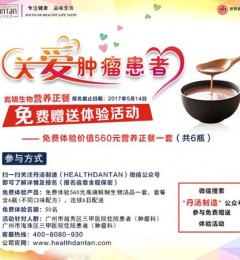 2017年5月8日至5月14日,关注“丹汤制造”公众号,凡广州市越秀区、海珠区的三甲医院肿瘤科住院患者,即有机会免费体验价值560元的肿瘤调理系列高端鲜制生物汤品一套(共6瓶)。...【浏览全文】