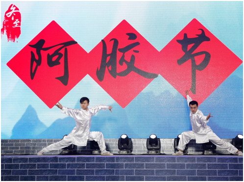 当晚子时刚到,伴随着古老而庄严的音乐声与铿锵有力的祭水文,国家级非物质文化遗产东阿阿胶炼制技艺代表性传承人、东阿阿胶股份有限公司总裁秦玉峰和徒弟们一起进行了九朝贡胶点火取水炼制仪式。依照传统,传承人到阿井祭拜药王并等候取水吉时;吉时一到,由传承人挑担、取水将第一担水倒入炼胶金锅。徒弟们们将水陆续倒入金锅结束后,传承人接过火把引火并走至炼胶锅处引燃锅下桑木柴。至此,冬至贡胶传统工艺生产线同步开始取水、点火炼胶。