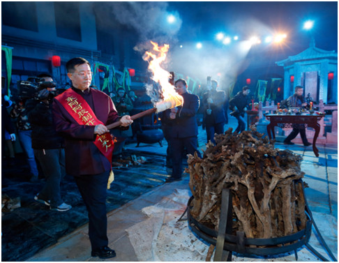 【图为:东阿阿胶总裁秦玉峰进行九朝贡胶点火取水炼制仪式】