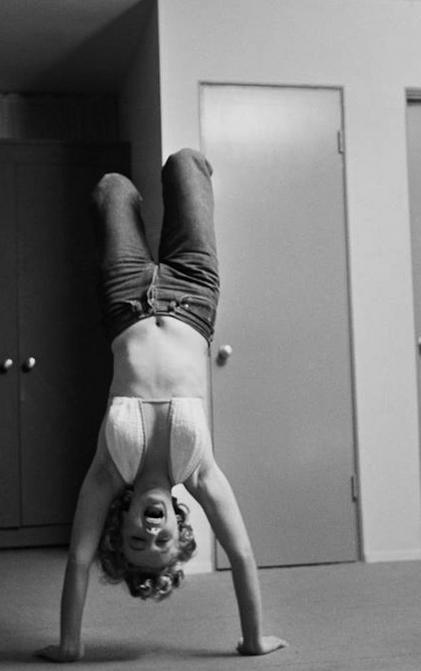 这是1952年在梦露洛杉矶郊区的小公寓里,拍摄了上百张照片,但只有一张被用于LIFE杂志的封面,其他都是没有曝光的画面。梦露穿着毛巾布的bikini、举着哑铃,和她娇柔的形象形成了对比,如此生活化的画面展示了梦露平易近人的一面。