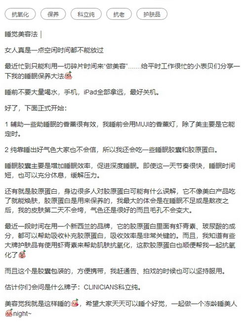 从张馨予的分享中可以看出,科学的睡眠和及时补充胶原蛋白是美容的两大法宝,而她采用的方式是服用睡美人睡眠胶囊和冻龄胶原蛋白胶囊。