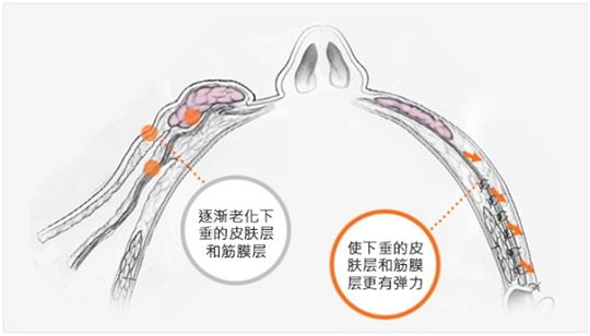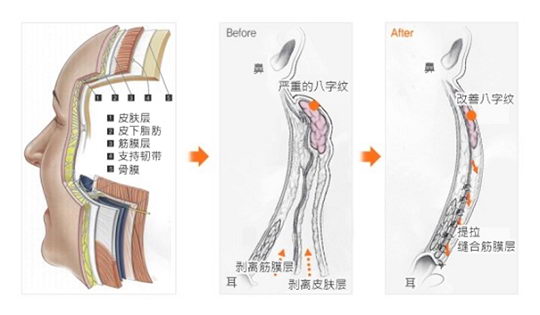 面部提升术对于老化下垂的苹果肌有很好的回春效果;对脸颊下垂,或脸颊中部形成的凹槽及鼻唇沟也有明显的消除作用,也可以同时改善因皮下脂肪减少而造成的嘴角下垂、塌陷问题。所以面部提升术在改变面部轮廓的同时,还可明显改善法令纹加深及面部组织的松弛状态,使面部年轻化更到位。