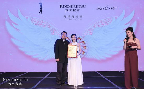 随kyoga创办人王媛女士、知名空中瑜伽培训师等人上台轮流分享小粉瓶的卓越功效和使用心得后,张先生登台介绍品牌故事与品牌理念,并为王媛女士授予木之秘密2019年度白金合作伙伴荣誉证书。