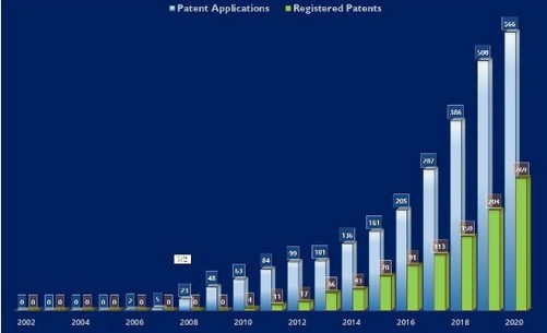 创新是CAREGEN最核心的理念之一,自集团成立以来始终专注于成分研发,全球专利申请及认证数量逐年猛增,截止到2023年Q1季度已研发出高达1024个仿生肽,其中619个已获得专利成分认证。
