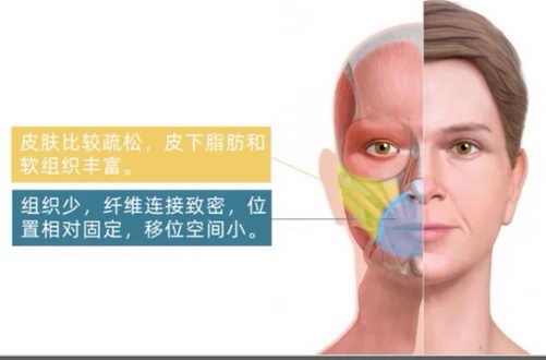 面部软组织松弛下垂,皮肤变薄、骨质流失,这种常常伴有法令纹外侧脂肪肥厚(苹果肌浅层脂肪下移膨出),因重力作用而缓慢下垂,皮肤弹性也会减少,从而表现为两颊凹陷,口角处皮肤松垂。即使不做任何面部表情,也能看到明显的深而长的面部褶皱。