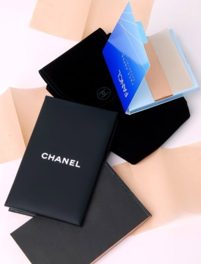 好漂亮!不愧是CHANEL,连吸油面纸也做得这么精致,一个黑色类似于皮质的套包里有一面小镜子,每一片吸油纸上还印着CHANEL的LOGO。