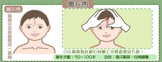 开天门位于两眉中至前发际成一直线,以两拇指自眉心向上额交替直推至天庭50~100次,可发汗解表、安神镇惊。